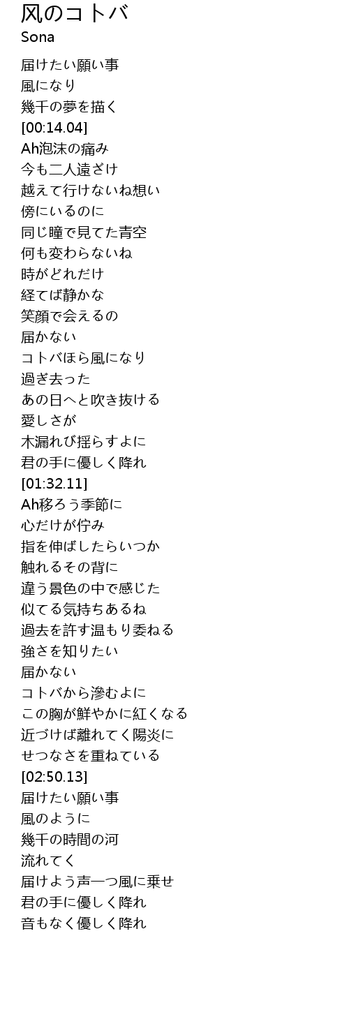 | [01:11.76] | コトバほら風になり |