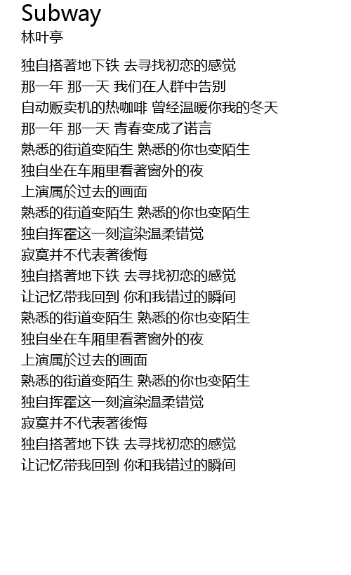 | [00:34.66] | dú zì dā zhe dì xià tiě qù xún zhǎo chū liàn de gǎn jué |