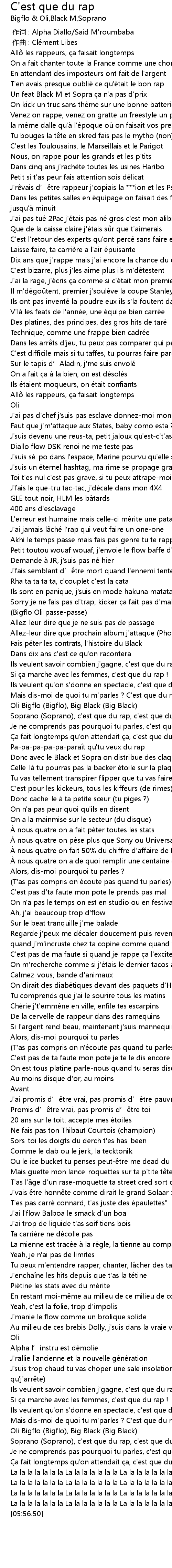 | [05:26.12] | Mais dismoi de quoi tu m' parles ? C' est que du rap ! |