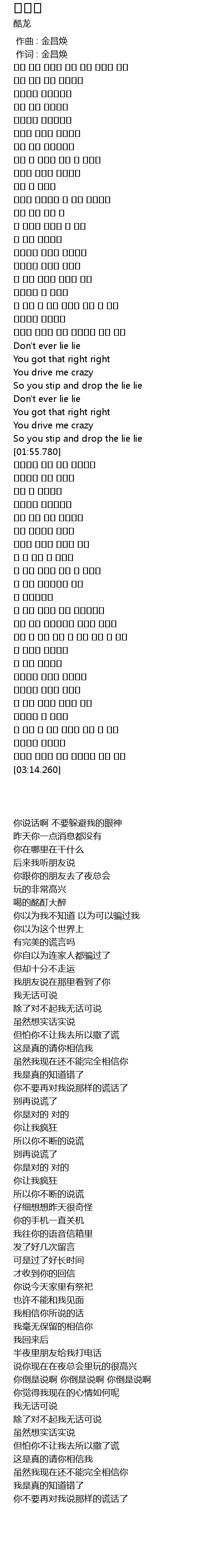 | [01:31.740] | 다시는 나에게 그런 거짓말은 하지 말어 |