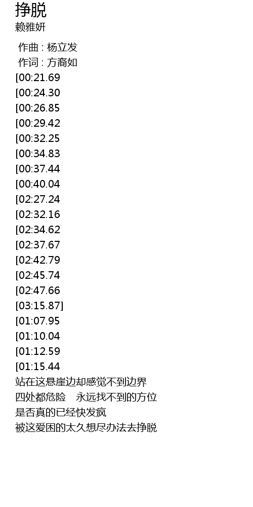 | [03:12.48][02:47.66][01:59.83][01:04.31] | 我要挣脱 挣脱 挣脱 |