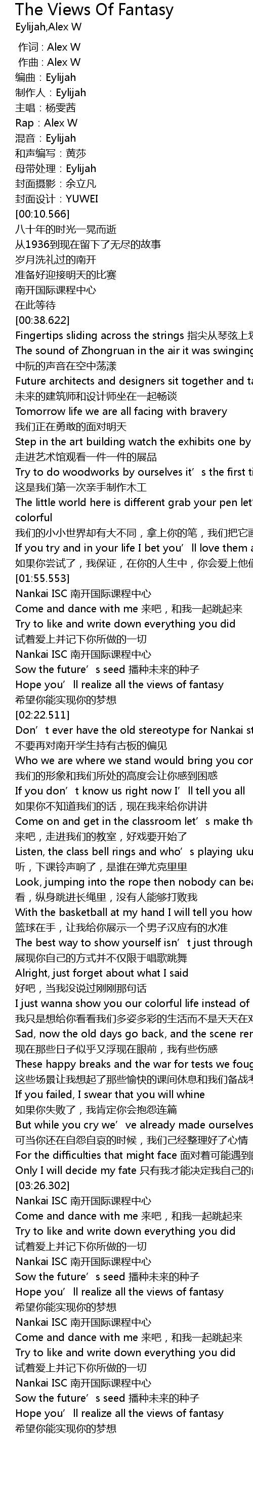 | [03:46.651] | Hope you’ll realize all the views of fantasy 希望你能实现你的梦想 |