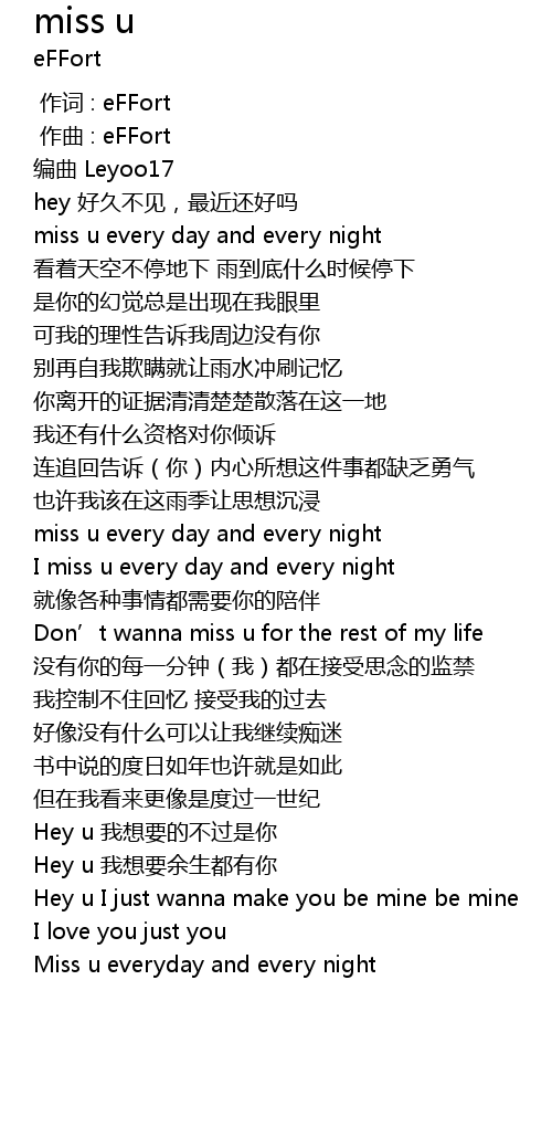 | [01:29.804] | Don' t wanna miss u for the rest of my life |