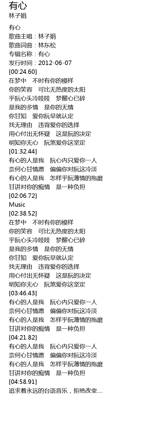 | [04:24.92] | 有心的人是我 阮心内只爱你一人 |