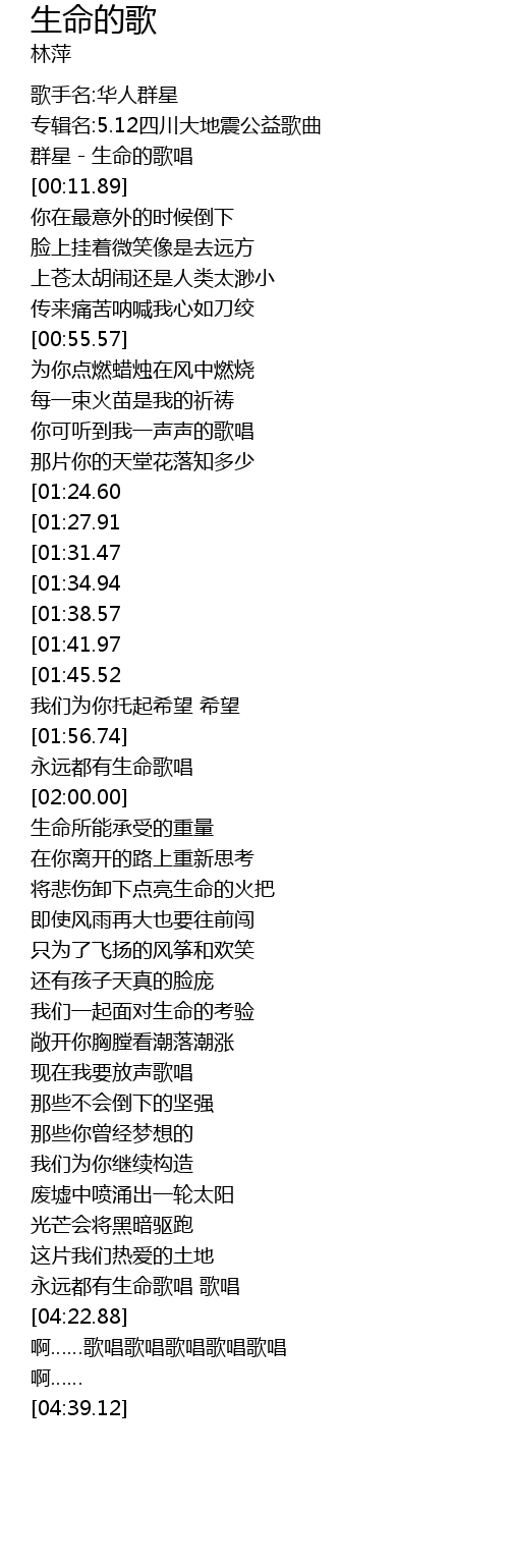 | [00:00.12] | 群星-生命的歌唱 |