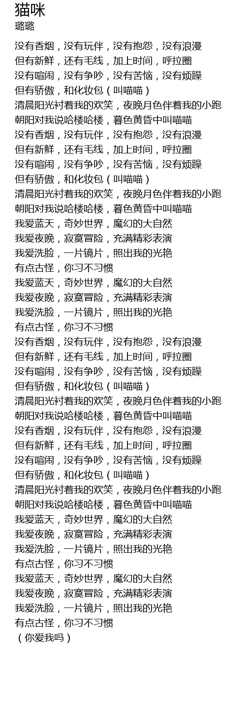 | [03:01.20] | 朝阳对我说哈楼哈楼,暮色黄昏中叫喵喵 |