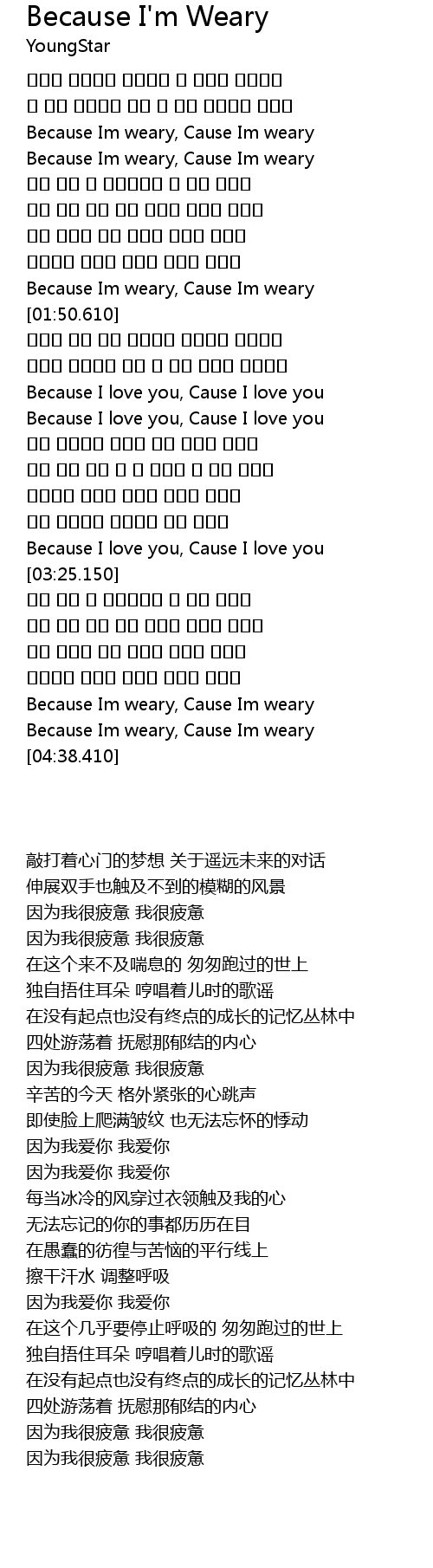 | [01:38.460] | Because Im weary, Cause Im weary |