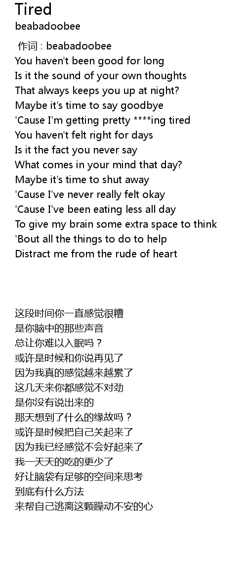 | [00:43.37] | ' Cause I' m getting pretty ing tired |