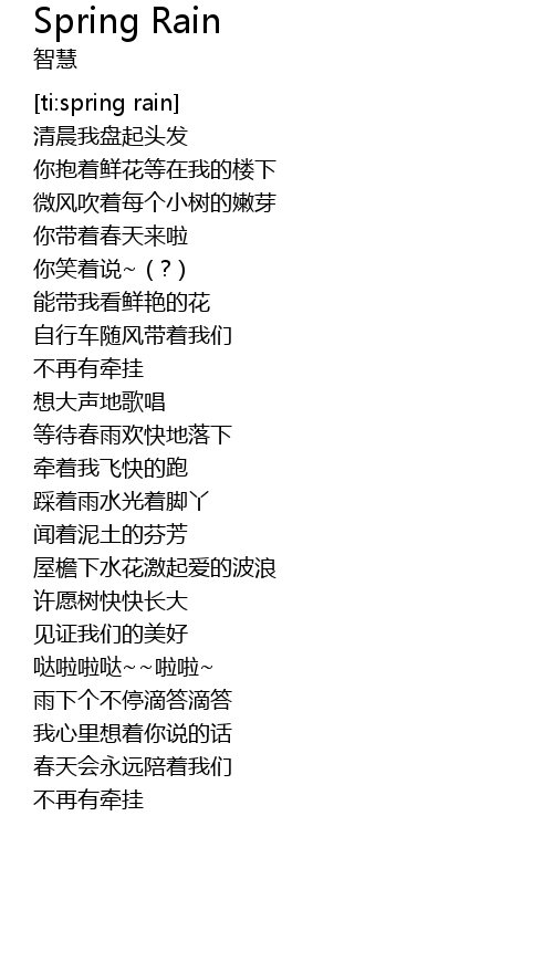 | [00:07.809] | děng dài chūn yǔ huān kuài dì là xià |