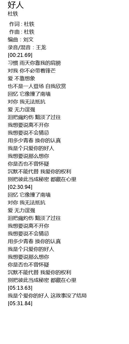 | [05:17.13] | 我是个爱你的好人 这故事没了结局 |