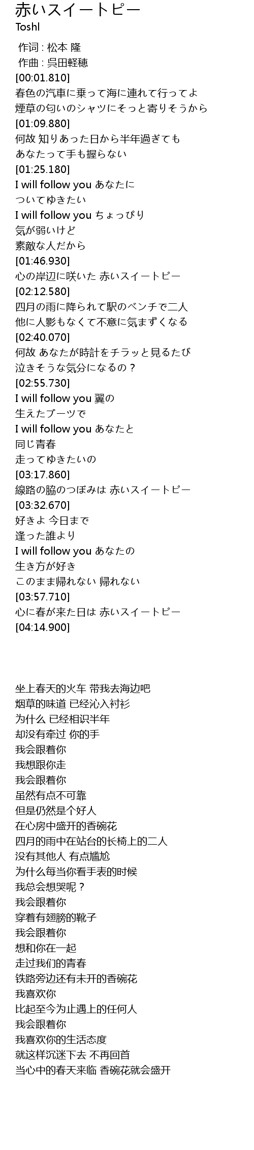 | [01:48.410] | 心の岸辺に咲いた 赤いスイートピー |