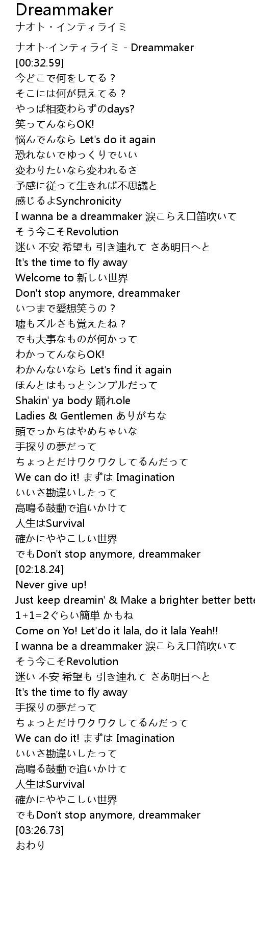 | [00:00.00] | ナオト·インティライミ - Dreammaker |