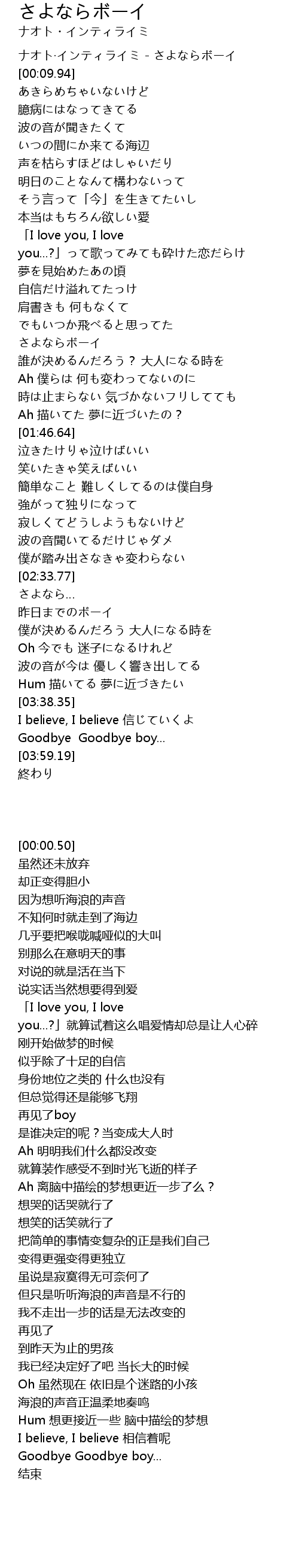 | [00:00.50] | ナオト·インティライミ - さよならボーイ |