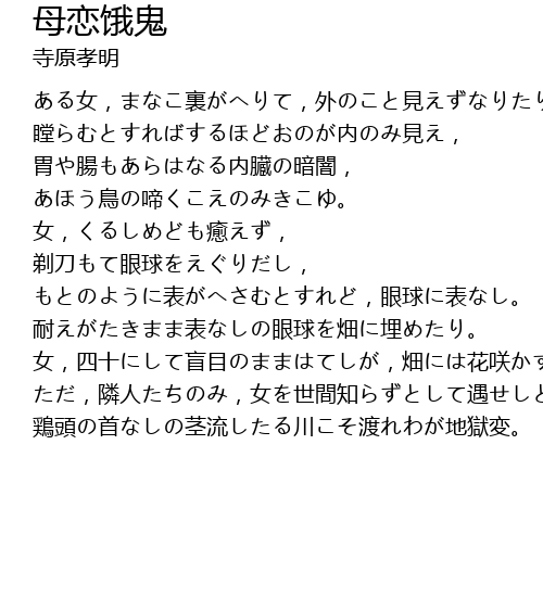 | [02:44.32] | 鶏頭の首なしの茎流したる川こそ渡れわが地獄変。 |