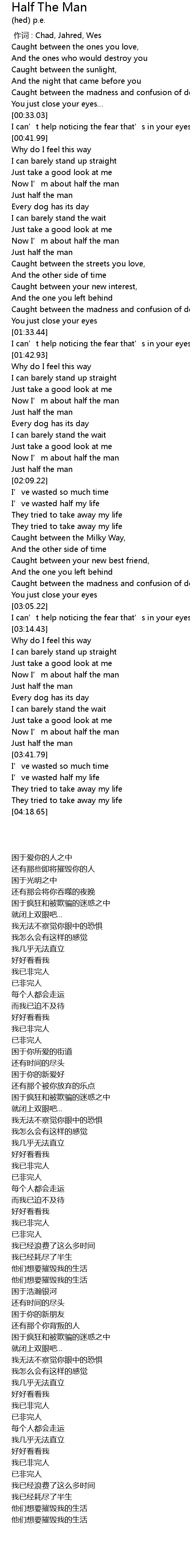 | [03:34.71] | Now I’m about half the man |