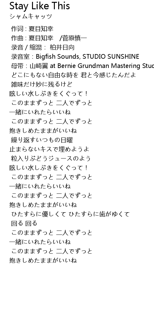 | [01:59.495] | このままずっと 二人でずっと 一緒にいれたらいいね |