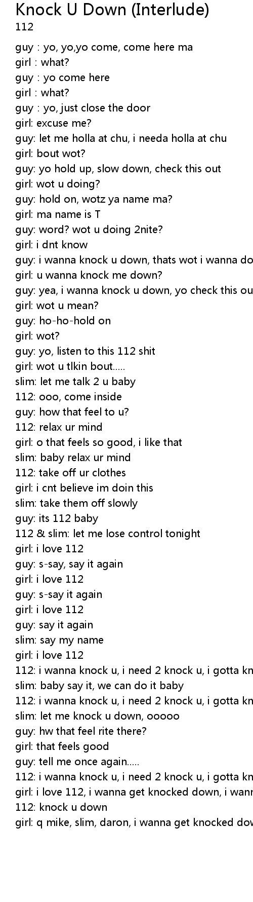 | 112: i wanna knock u, i need 2 knock u, i gotta knock u | |