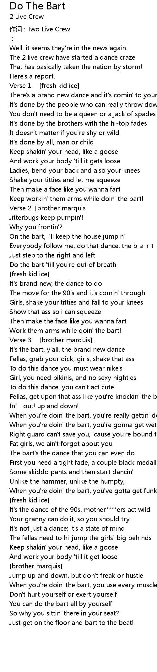 | Everybody follow me, do that dance, the b-a-r-t | |