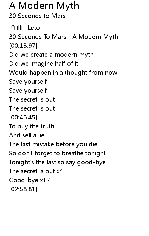 | [00:00.00] | 30 Seconds To Mars A Modern Myth |