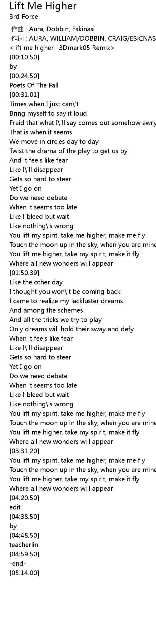| [03:06.28] | You lift my spirit, take me higher, make me fly |
