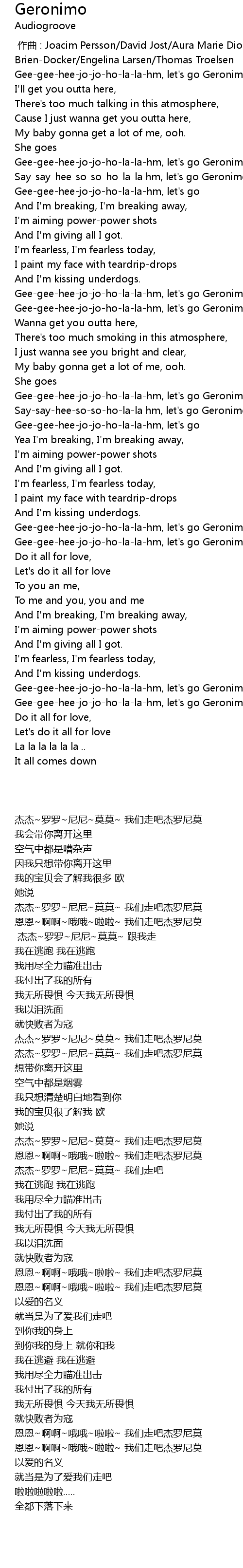 | [00:01.000] | Gee-gee-hee-jo-jo-ho-la-la-hm, let's go Geronimo |