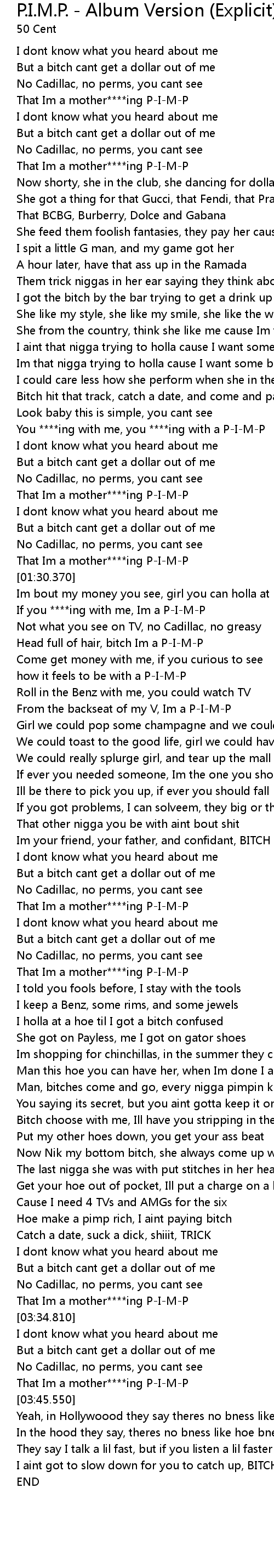 | [01:34.330] | If you ****ing with me, Im a P-I-M-P |
