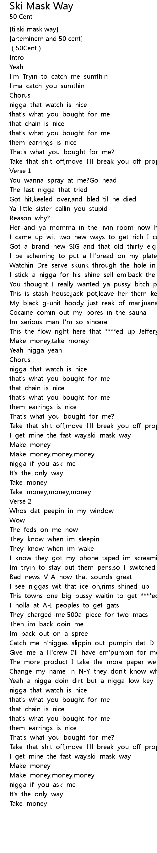 | [01:13.384] | I get mine the fast way, ski mask way |