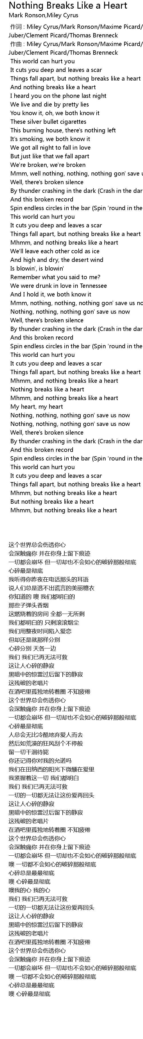| [02:20.266] | Mhmm, and nothing breaks like a heart |