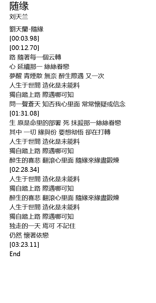 | [00:00.00] | 劉天蘭-隨緣 |