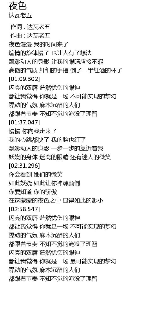 | [00:01.000] | 作曲 : 达瓦老五 |