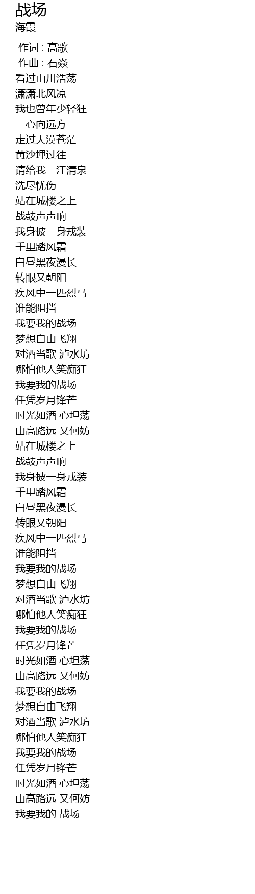 | [01:29.46] | wǒ yào wǒ de zhàn chǎng |