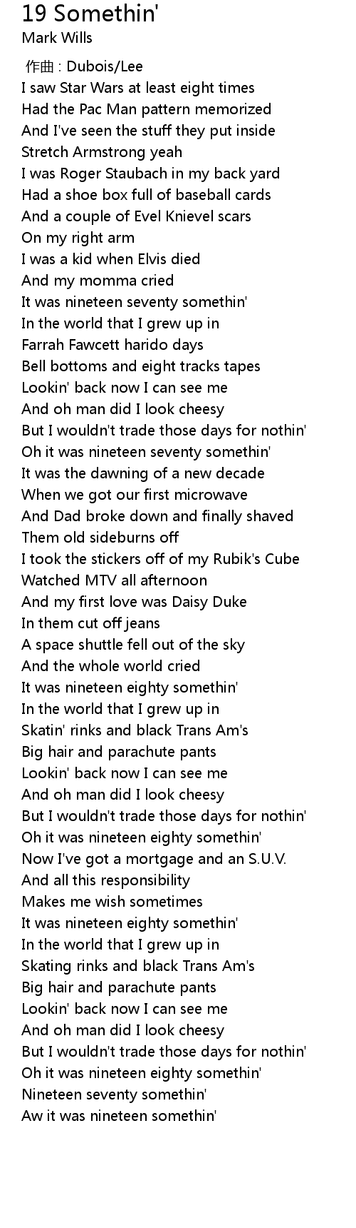 | [00:51.10] | It was nineteen seventy somethin' |