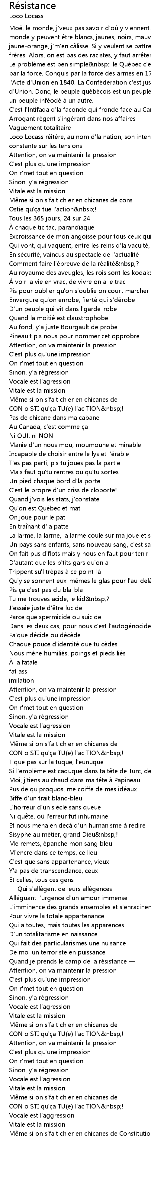 | Moé, le monde, j' veux pas savoir d' où y viennent. J' veux savoir où y vont. Le monde y peuvent tre blancs, jaunes, noirs, mauves, bleus avec des pitons jauneorange, j' m' en c lisse. Si y veulent se battre avec moé, c' est mes frè res. Alors, on est pas des racistes, y faut arr ter de toujours s' excuser. Le problè me est ben simple nbsp: le Qué bec c' est un pays conquis et annexé par la force. Conquis par la force des armes en 1760, annexé par la force avec l' Acte d' Union en 1840. La Confé dé ration c' est juste la suite de l' Acte d' Union. Donc, le peuple qué bé cois est un peuple soumis, un peuple vassalisé, un peuple infé odé à un autre. | |
