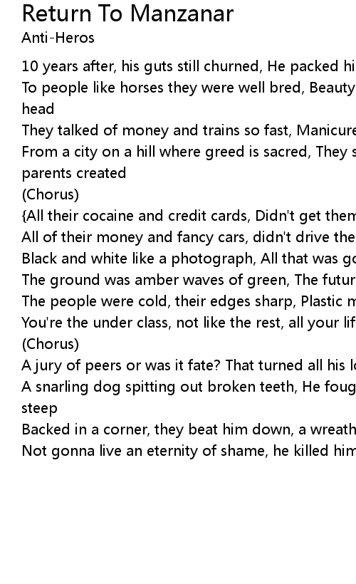 All of their money and fancy cars, didn't drive them far from Manzanar} |