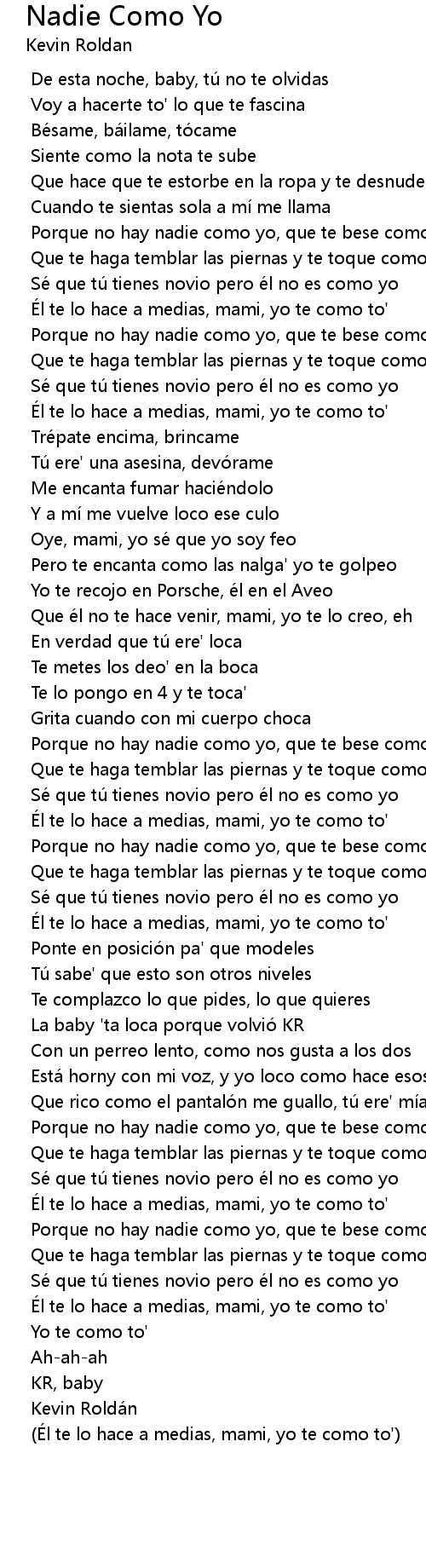 | [01:36.796] | Porque no hay nadie como yo, que te bese como yo |