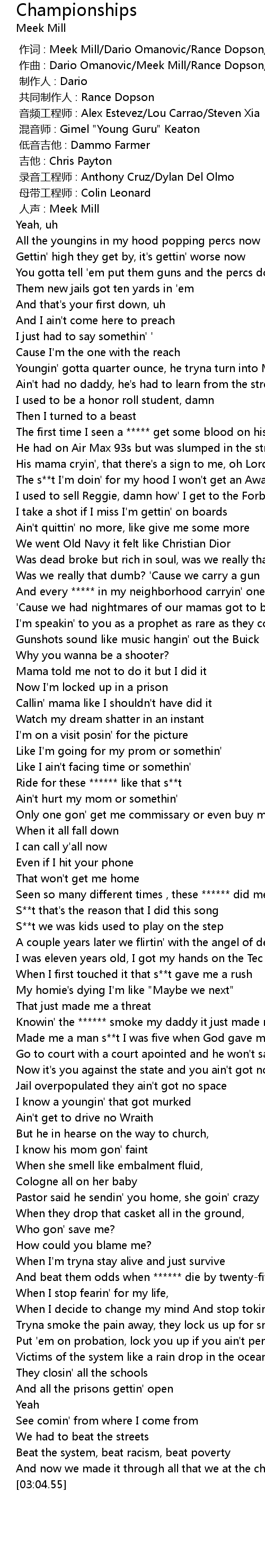 | [00:00.909] | zuo qu : Dario Omanovic Meek Mill Rance Dopson Toney Fountaine |