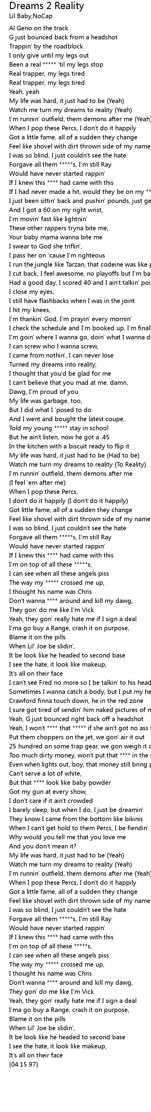 | [00:14.58] | Been a real ***** 'til my legs stop |