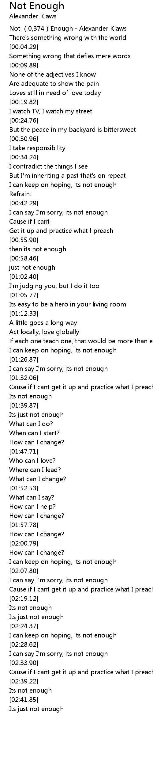 | [00:00.00] | Not (0,374)Enough - Alexander Klaws |