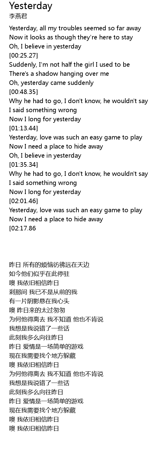 | [02:24.47][02:17.86] | Oh, I believe in yesterday |