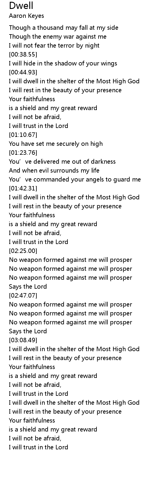 | [01:43.00] | I will dwell in the shelter of the Most High God |