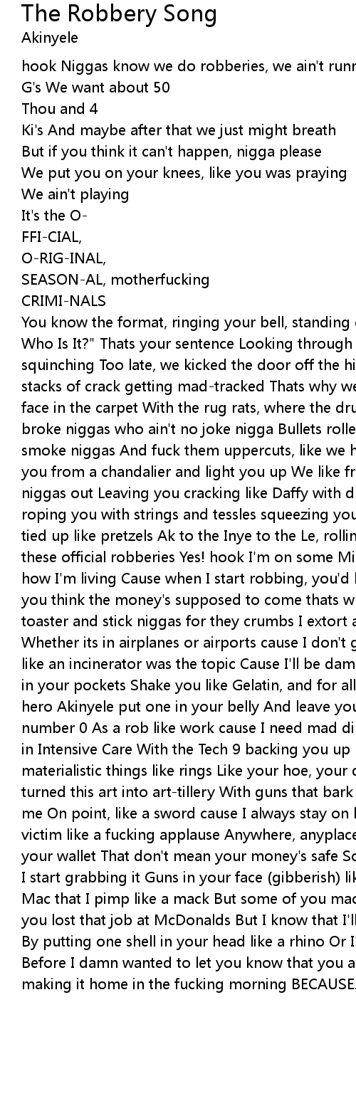 Who Is It?" Thats your sentence Looking through the peephole with your eyes squinching Too late, we kicked the door off the hinges I heard you selling stacks of crack getting mad-tracked Thats why we in your place, throwing your face in the carpet With the rug rats, where the drugs at, FUCK THAT! I represent broke niggas who ain't no joke nigga Bullets rolled in Bamboo cause we here to smoke niggas And fuck them uppercuts, like we here to fight you up Man, we hang you from a chandalier and light you up We like free delivery cause we take niggas out Leaving you cracking like Daffy with duct tape on your mouth And roping you with strings and tessles squeezing your blood vessel Leaving your ass tied up like pretzels Ak to the Inye to the Le, rolling with real G's Doing these official robberies Yes! hook I'm on some Mike Tyson ex-wife shit kid Thats how I'm living Cause when I start robbing, you'd better start giving How else you think the money's supposed to come thats why When I need bread I grab the toaster and stick niggas for they crumbs I extort as you get stuck for bucks Whether its in airplanes or airports cause I don't give a flying fuck I drop it like an incinerator was the topic Cause I'll be damned if you ain't I'll empty in your pockets Shake you like Gelatin, and for all you good semaritans playing hero Akinyele put one in your belly And leave your stomachs looking like the number 0 As a rob like work cause I need mad dinero Cream, like Vaseline put you in Intensive Care With the Tech 9 backing you up like spines Taking your materialistic things like rings Like your hoe, your doe, gold and diamonds I turned this art into art-tillery With guns that bark to keep them from killing me On point, like a sword cause I always stay on board Ready to clap a stinking victim like a fucking applause Anywhere, anyplace Even if you got condoms in your wallet That don't mean your money's safe So act like you not having it when I start grabbing it Guns in your face (gibberish) like you talk Arabic Holding a Mac that I pimp like a mack But some of you macks, never find a Mac Ever since you lost that job at McDonalds But I know that I'll Mork your ass like Nanu-Nanu By putting one shell in your head like a rhino Or I'll do to 2 to your head Before I damn wanted to let you know that you ain't who's hot And you niggas not making it home in the fucking morning BECAUSE.............. hook |