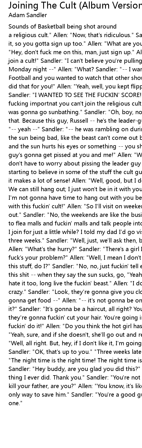 Sandler: "Hey man, I'm joining a religious cult." Allen: "Now, that's ridiculous." Sandler: "Well, I'm joining it, so you gotta sign up too." Allen: "What are you talking about?" Sandler: "Hey, don't fuck me on this, man, just sign up." Allen: "No, I'm not going to join a cult!" Sandler: "I can't believe you're pulling this shit on me after Monday night --" Allen: "What? Sandler: "-- I wanted to watch Monday Night Football and you wanted to watch that other show and we watched your show -- I did that for you!" Allen: "Yeah, well, you kept flippin' back to the game." Sandler: "I WANTED TO SEE THE FUCKIN' SCORE! Whadda you gotta do that's so fucking importnat you can't join the religious cult with me?" Allen: "Well, I was gonna go sunbathing." Sandler: "Oh, boy, no no, I don't think you should do that. Because this guy, Russell -- he's the leader-guy of the cult --" Allen: "-- yeah --" Sandler: "-- he was rambling on during one of the speeches about the sun being bad, like the beast can't come out because the sun's too bright and the sun hurts his eyes or something -- you show up all sunburned and that guy's gonna get pissed at you and me!" Allen: "Well, I'm not in the cult, so I don't have to worry about pissing the leader guy off!" Sandler: "Look, I'm -- starting to believe in some of the stuff the cult guy's been saying -- some of it makes a lot of sense! Allen: "Well, good, but I don't want to join the cult. We can still hang out; I just won't be in it with you." Sandler: "The point is, I'm not gonna have time to hang out with you because I'm gonna be fuckin' busy with this fuckin' cult!" Allen: "So I'll visit on weekends -- we'll work it out." Sandler: "No, the weekends are like the busiest time -- that's when we go to flea malls and fuckin' malls and talk people into joining, man!" Allen: "Can I join for just a little while? I told my dad I'd go visit him in Florida in three weeks." Sandler: "Well, just, we'll ask then, but we gotta join now." Allen: "What's the hurry?" Sandler: "There's a girl I wanna meet there, what the fuck's your problem?" Allen: "Well, I mean I don't really have to believe in this stuff, do I?" Sandler: "No, no, just fuckin' tell everybody you believe in this shit -- when they say the sun sucks, go, "Yeah, fuck the sun, I fuckin' hate it too, long live the fuckin' beast." Allen: "I don't know, man. This is crazy." Sandler: "Look, they're gonna give you clothers, a free haircut, you're gonna get food --" Allen: "-- it's not gonna be one of those weird haircuts, is it?" Sandler: "It's gonna be a haircut, all right? You said you need a haircut, they're gonna fuckin' cut your hair. You're going in, saving twelve bucks, just fuckin' do it!" Allen: "Do you think the hot girl has a friend for me?" Sandler: "Yeah, sure, and if she doesn't, she'll go out and recruit one for you!" Allen: "Well, all right. But, hey, if I don't like it, I'm going to escape, man." Sandler: "OK, that's up to you." "Three weeks later!" |