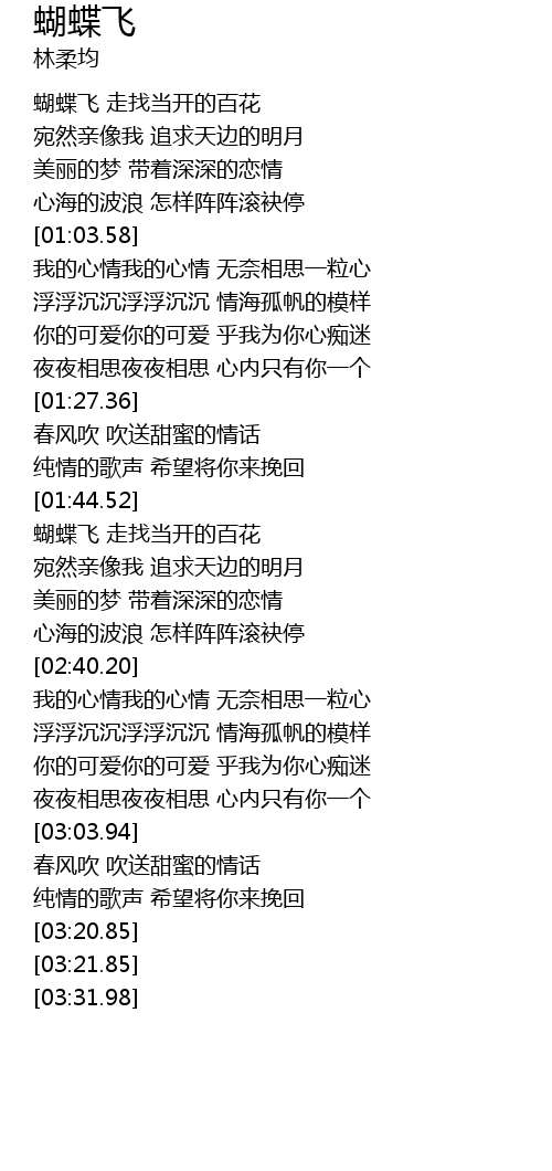 | [00:32.88] | 蝴蝶飞 走找当开的百花 |