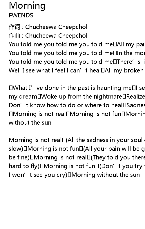 | Morning is not real All the sadness in your soul couldn' t go slow Morning is not fun All your pain will be gone in the morning you' ll be fine Morning is not real They told you there' s a life after dawn, so hard to fly Morning is not fun Don' t you try to wake up from nightmare, I won' t see you cry Morning without the sun |