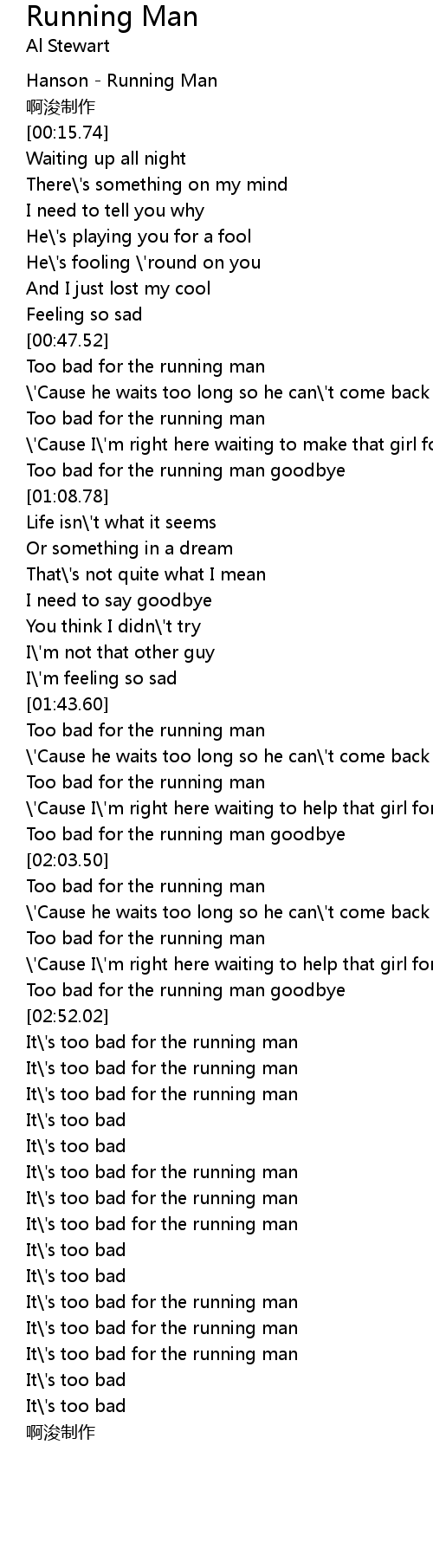 | [01:46.75] | ' Cause he waits too long so he can' t come back again |