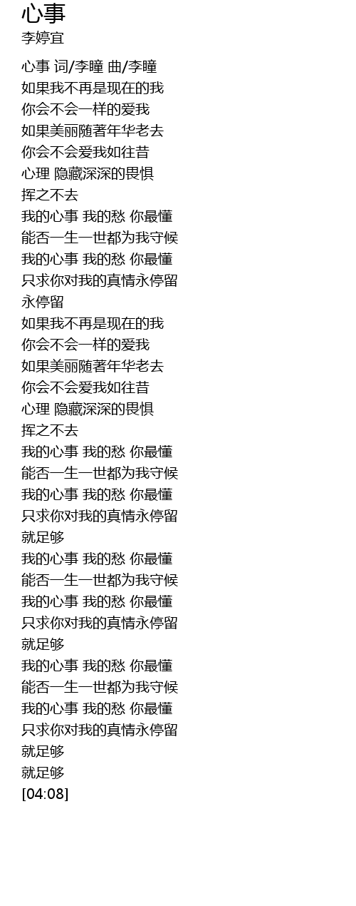 | [00:00] | 心事 词/李瞳 曲/李瞳 |