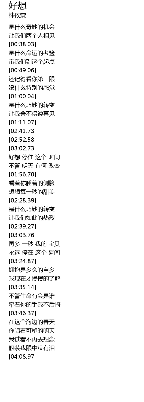 | [04:22.28][02:52.58][01:24.38] | 有你 陪在 我的 身边 |