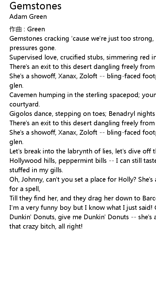 | Gemstones cracking ' cause we' re just too strong, drumsized yearning ' cause the pressures gone. | |