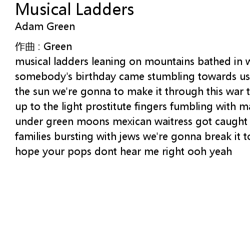 | musical ladders leaning on mountains bathed in white laughter under the sun somebody' s birthday came stumbling towards us wrapped in green gladness under the sun we' re gonna to make it through this war tonight someone hold this child up to the light prostitute fingers fumbling with matches tucked in red couches under green moons mexican waitress got caught in the crossfire of militant families bursting with jews we' re gonna break it to your folks tonight kind of hope your pops dont hear me right ooh yeah |