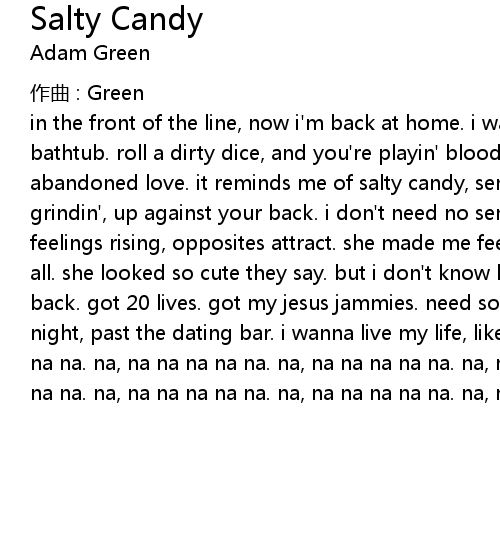 | in the front of the line, now i' m back at home. i wanna live my life, in a bathtub. roll a dirty dice, and you' re playin' blood. stole a maxipad, because i abandoned love. it reminds me of salty candy, semen shanties, sailboats grindin', up against your back. i don' t need no sentimental. penis stencil, feelings rising, opposites attract. she made me feel so small i had no say at all. she looked so cute they say. but i don' t know her that way. heaven hold me back. got 20 lives. got my jesus jammies. need some exercise. take a walk at night, past the dating bar. i wanna live my life, like a trackstar. na, na na na na na. na, na na na na na. na, na na na na na. na, na na na na na. na, na na na na na. na, na na na na na. na, na na na na na. na, na na na na na. |